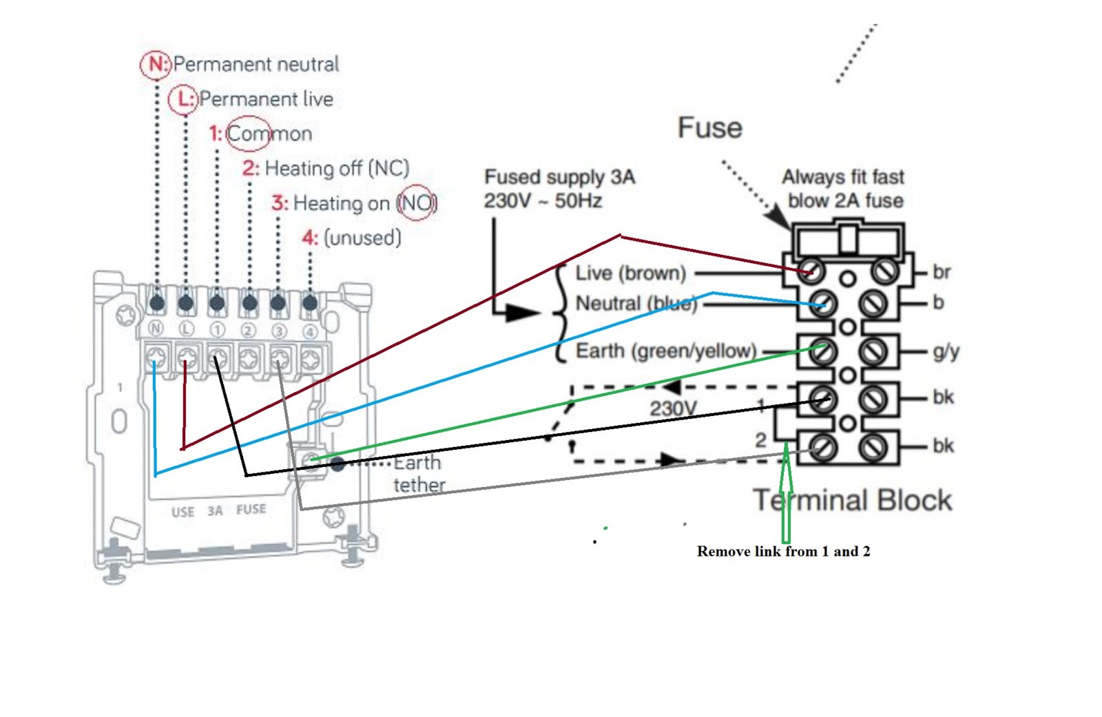 Exactly te same wires as me. The hive was installed about 6 months ago, before that. It must be supplied via a switched fused spur with a minimum contact separation of 3mm (both live and neutral) and fitted with a 3a fuse.